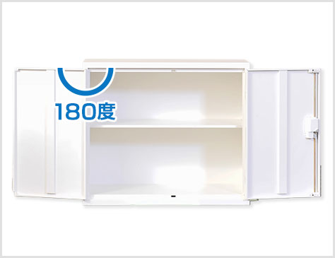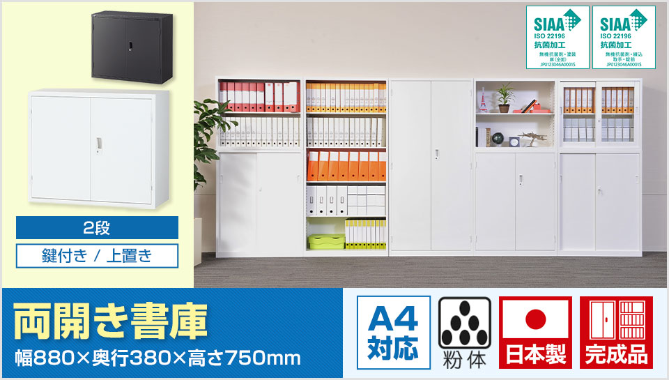 A4ファイルの収納に対応した両開きタイプの書庫です。扉は180度オープンで収納物を楽に取り出すことができます。