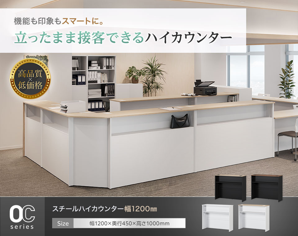 立ったままでの接客に丁度いい高さ1000mmのハイカウンターです。お客様側と執務側の両側に、手荷物や備品が置ける便利な中棚付き。カウンター周りをすっきり整理でき、通路の動線もスムーズに。スチール製で耐久性に優れ、さらに粉体塗装を施しているので指紋などの汚れが目立ちにくく、日々のお手入れ負担を軽減します。スタンダードなデザインと木目調を含む豊富な4色のラインナップで、公共施設から商業施設、オフィスまで様々な空間に馴染みます。