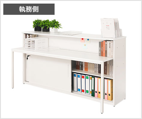 別売りのハイカウンター内側に固定して使用でき、天板高さは一般的な事務デスクと同じ720mm。座って事務作業をしながら、来客時には顔を上げるだけでスムーズに応対できます。PC画面や内部資料をお客様から見えにくい位置に置けるため、受付まわりのセキュリティ確保にも役立ちます。