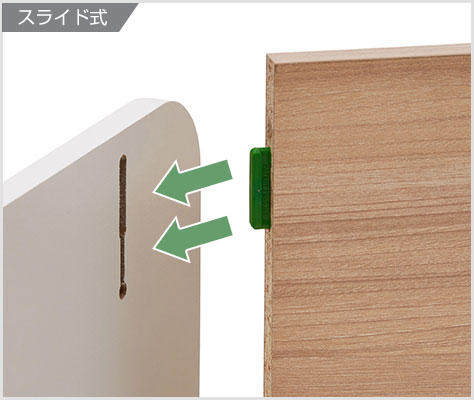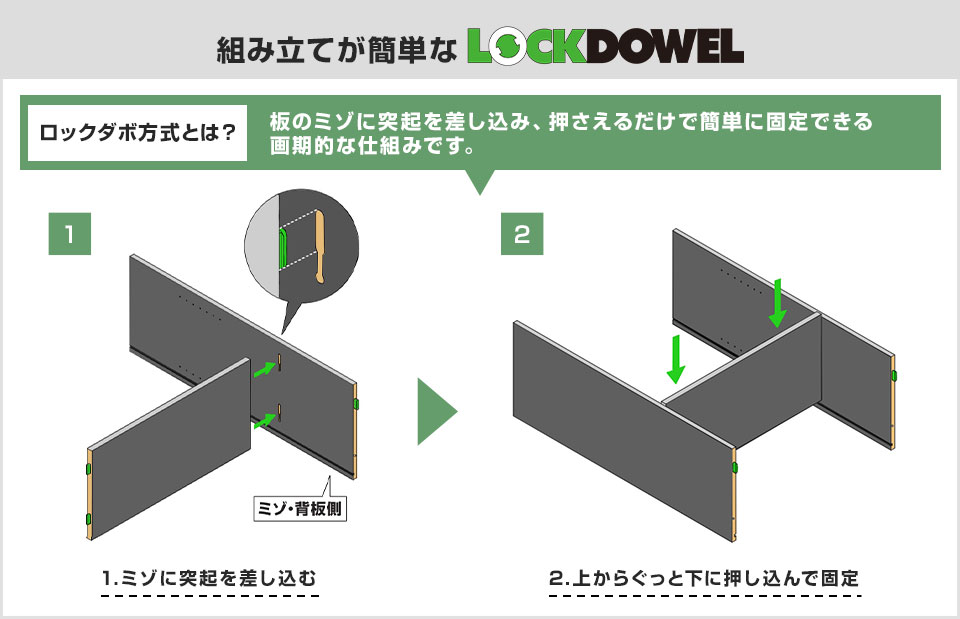 使いやすいシンプルな構造に加えて、組み立てやすい「ロックダボ方式」の採用もポイント。突起を横から差し込むだけのスライド式です。
