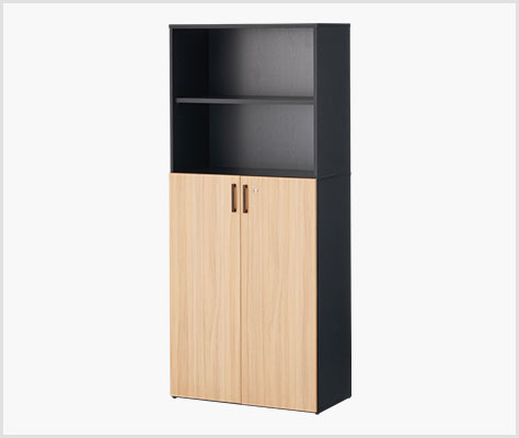 理想的なオフィス空間を手軽にスマートに実現する「NFシリーズ」の木製キャビネットです。幅広い場面に合わせやすいシンプルデザインで、木目調の扉をオプションで取り付けることもできます。収納部はA4ファイルにも対応する5段オープンタイプで、棚板は自由に高さを調節できる可動式。板のミゾに突起を差し込むだけの「ロックダボ方式」の採用により、従来品に比べて時短で簡単に組み立てできるのもポイントです。