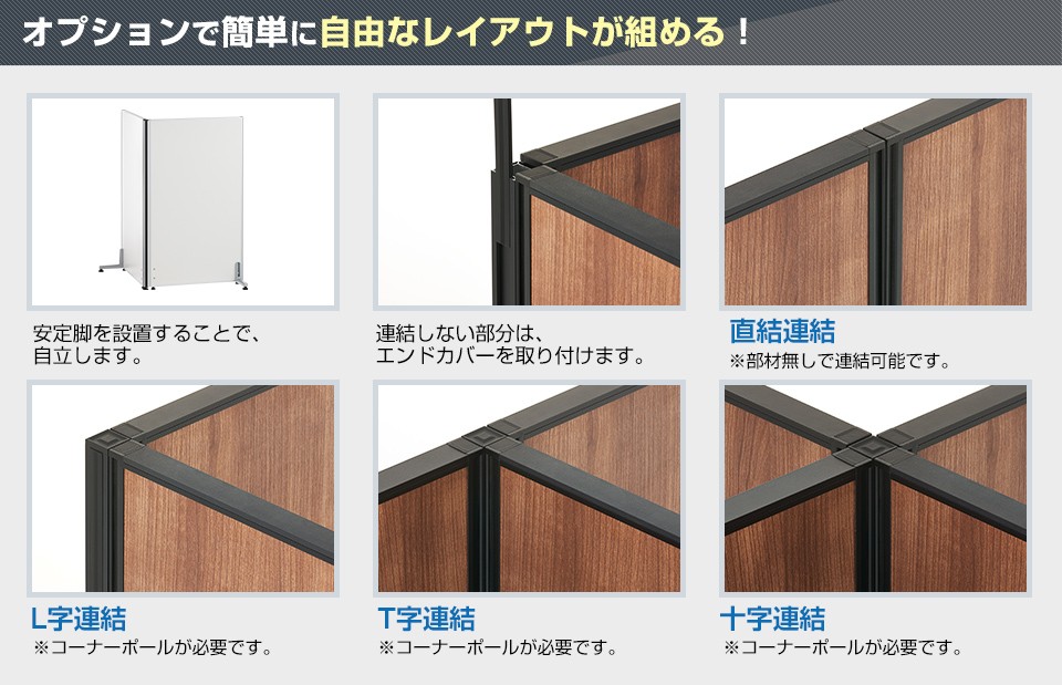 パネルを自立させる「安定脚」、連結しない側面に取り付けて安全性と美観性を高める「エンドカバー」、直角連結を可能にする「コーナーポール」の3つのオプションと連結パターンを組み合わせ、間仕切りから独立空間まで幅広く対応。連結方法次第で、多様なレイアウトが実現します。