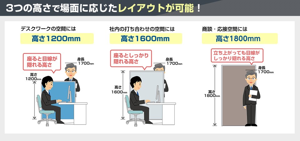 着座時に目線を遮る1200mmは、デスクスペースの設置に適した高さで集中力向上を促進。顔を上げてコミュニケーションをとることができます。着座時に体が隠れる1600mmは、よりパーソナルスペースを確保し、社内の打ち合わせスペースやコールセンターの仕切りなどにおすすめ。立位時も目線を遮る1800mmは、しっかりと間仕切れるので、商談・応接スペースなどプライバシーを確保したい空間に。シーンに合わせて3サイズからお選びいただけます。