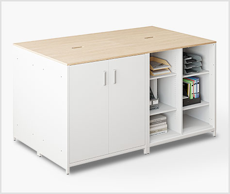 雑多に見えがちなゴミ箱スペースを、美しく機能的なカフェコーナーに。OCシリーズスチール収納カウンター(ゴミ箱収納タイプ/ゴミ箱2個付きセット/フラット天板)は、大容量のゴミ箱を収納しながら、コーヒーマシンも設置可能。面倒な配線や給排水もスマートに整理でき、理想のリフレッシュスペースを手軽に実現します。