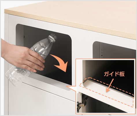 ペットボトルをそのまま入れやすい高さ200mmの投稿口と、ゴミがゴミ箱の隙間に落ちるのを防ぐガイド板を設置。