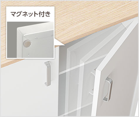 ゆっくり閉まるソフトクローズ機構と、扉の浮きを防ぐマグネットを搭載。不意に扉が開くことなく、閉まる際の衝撃音を抑えます。