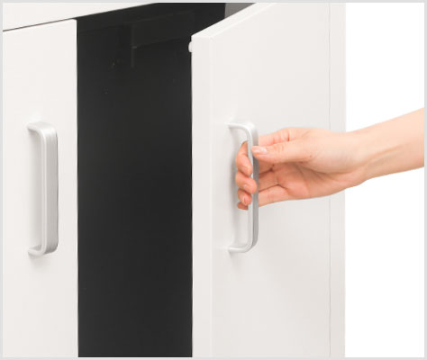 左右に開く両開き扉。取っ手はしっかりと掴みやすいコの字型で、開閉しやすいシンプルな形状です。