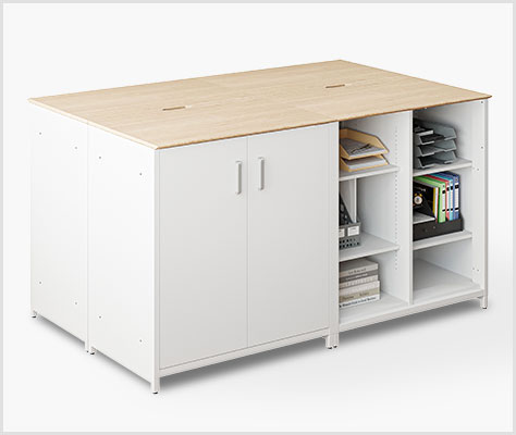 雑多に見えがちなゴミ箱スペースを、美しく機能的なカフェコーナーに。OCシリーズスチール収納カウンター(ゴミ箱収納タイプ/ゴミ箱2個付きセット/船底天板)は、大容量のゴミ箱を収納しながら、コーヒーマシンも設置可能。面倒な配線や給排水もスマートに整理でき、理想のリフレッシュスペースを手軽に実現します。