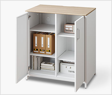 雑多に見えがちなオフィスの一角を、美しく機能的なカフェコーナーに。OCシリーズスチール収納カウンター(開き戸タイプ/船底天板)は、備品をすっきりと収納しながら、本格的なコーヒーマシンも設置可能。面倒な配線や給排水もスマートに整理でき、理想のリフレッシュスペースを手軽に実現します。
