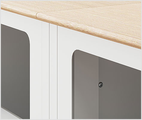 コーヒーマシンをスマートに設置できるこだわりの設計。選べる2種類の天板に加え、同シリーズの「ゴミ箱収納」「オープン」タイプと連結可能です。