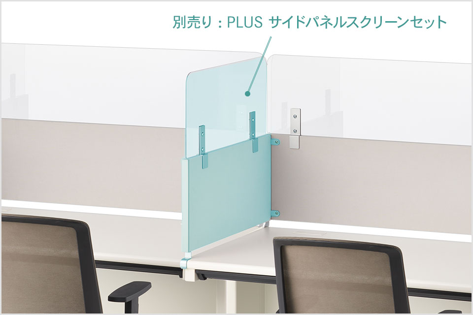 SH2デスクシリーズは、サイドタイプのパネルセットもラインアップ。正面だけでなく隣も仕切ることで、個別ブースのように囲まれたデスクスペースをつくれます。下のパネルが程よくプライバシーを確保し、作業に集中できるパーソナルスペースに。上の透明アッパースクリーンは視界を遮ることなく飛沫を防止。適度な間仕切りと飛沫対策を両立する、新たなデスクスタイルです。