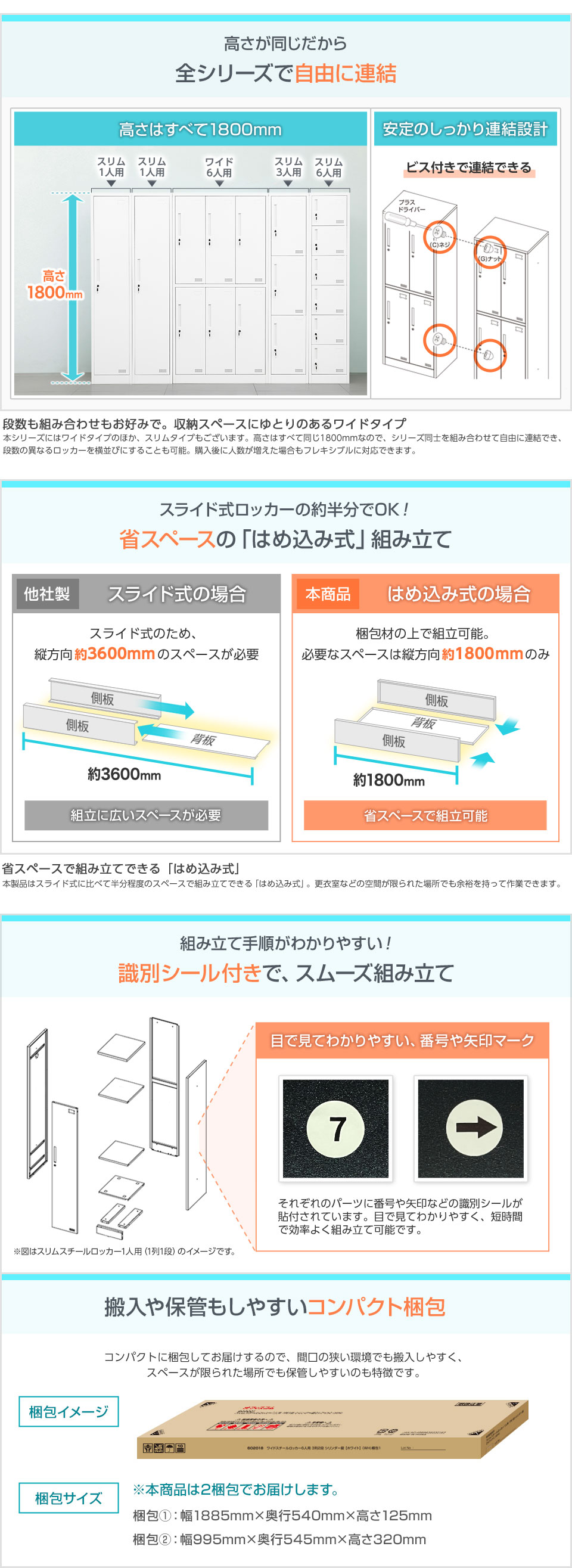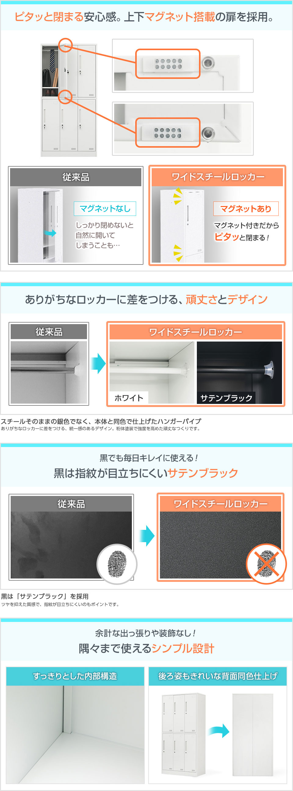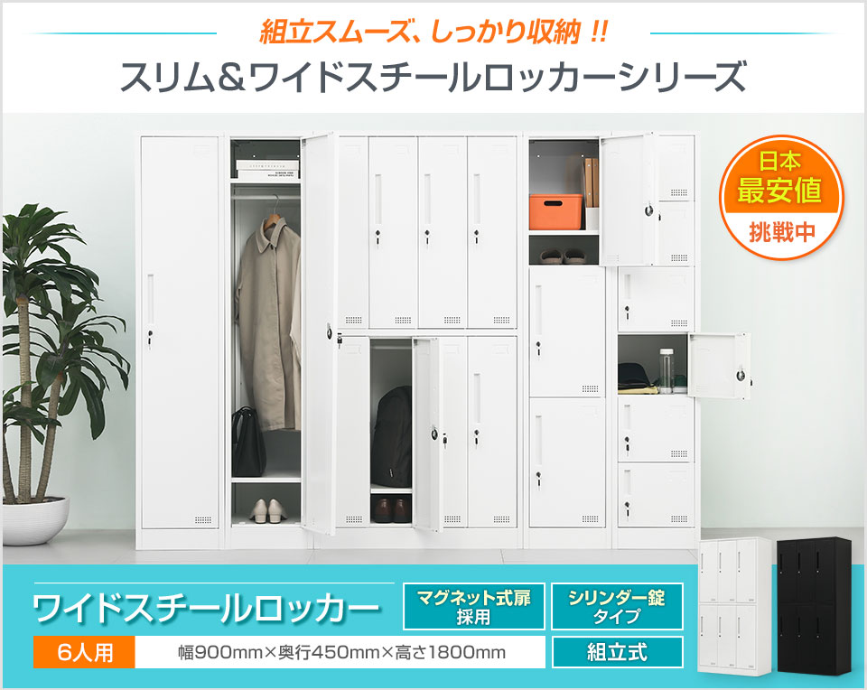 使いやすい、合わせやすい、お求めやすい。オフィスの基本のニーズに応えたシンプルなワイドロッカーです。頑丈なスチール製で、幅900×高さ1800mmの3列2段6人用タイプ。ホワイトとサテンブラックの2色展開で、幅広い空間になじむスタンダードなデザインに、シリンダー錠やハンガーパイプなどの機能を装備しました。複数を連結することでメンバーの増員にも対応。オフィスの更衣室や店舗のバックヤード、スポーツジムなど多様なシーンで活躍します。