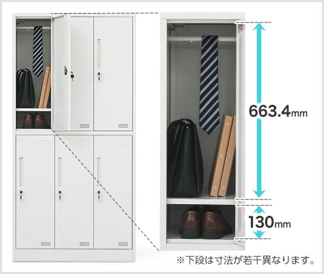 ハンガーパイプと棚板を備えた収納部。ネクタイを掛けたり、カバンや靴を置いたり、1人1人の用途に合わせて自由に活用できます。