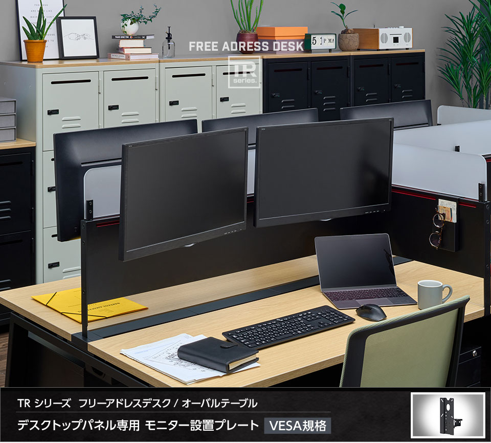 現代の多様なワークスタイルに応える、「TRシリーズ フリーアドレスデスク」のデスクトップパネルに取り付けられるモニター設置用プレートです。追加のオプションアイテムとして、フロント用のデスクトップパネルに組み合わせることで、PC用モニターをパネル上の見やすい位置に取り付けできます。画面の高さや、首振りの角度が自由に調節できるのもポイント。デスク周りの環境がいっそう充実します。※こちらは単品ではご使用いただけません。