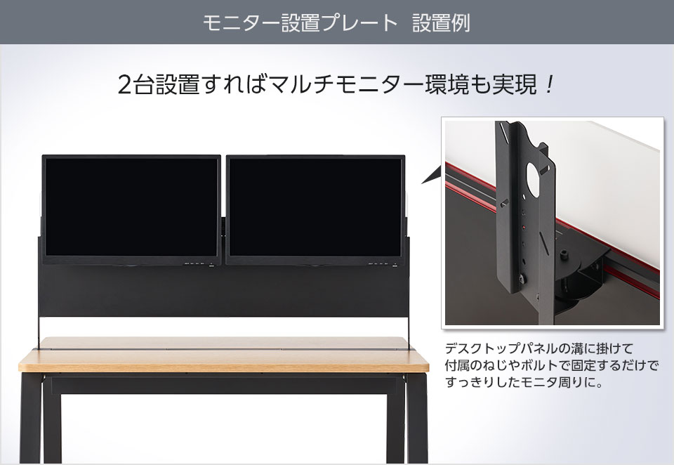 こちらのプレートを使用することで、TRシリーズのデスクトップパネル1枚につき、片面2台(両面4台)・各24インチまでのモニターが設置可能です。机上のPCやキーボードと接続することで、複数のモニターを同時に利用できるマルチモニターの環境を実現。画面を切り替えずに様々なブラウザや資料を表示でき、作業もいっそう捗ります。プレートの設置も簡単。デスクトップパネルの溝に掛けて付属の金具で留めるだけの単純な手順で取り付けできます。