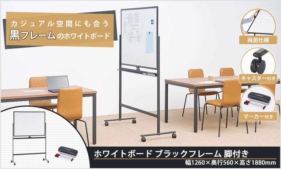 オフィスの会議室やセミナーの教室はもちろん、コワーキングスペースなどのカジュアル空間にも調和。繰り返し文字を書いて消せるホワイトボードに、シックなブラックフレームを組み合わせました。書き味もなめらかなスチール製で、届いてすぐに使えるマーカー&イレーサー付き。ミーティングや授業の内容がスムーズに伝わります。ワンタッチで回転できる両面仕様。キャスター付きで移動もラクラクです。マグネットにも対応し、社内掲示板としても活躍します。