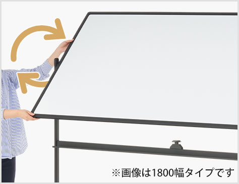 くるっとホワイトボードを回転し、手軽にふたつの面を切り替えることができます。表裏どちらの面にも書ける両面仕様です。