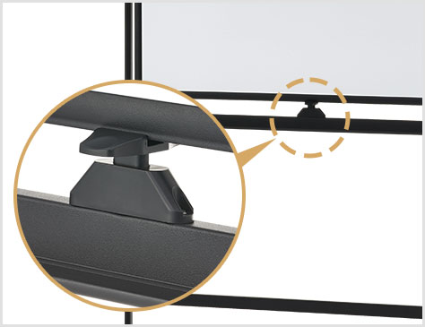 ホワイトボードのセンターには、便利なプッシュ式ストッパーが。操作は簡単。ワンタッチで板面を回転し、固定することができます。