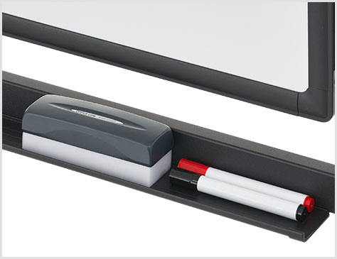 黒と赤のマーカーが1本ずつ付属します。さらに書いた文字を拭いて消せるイレーサー付き。トレイ(粉受け)に置いて活用できます。