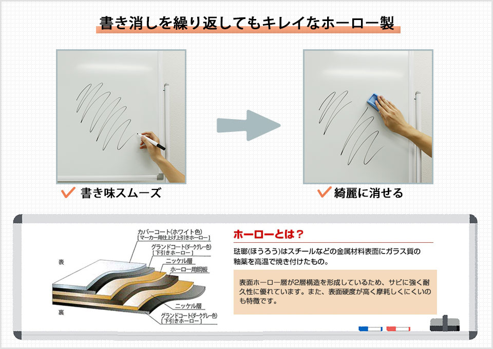 ホーロー製のホワイトボードは、表面をコーティングしているので滑りが良く、書き味はよりなめらか。表面が2層構造なので、耐久性に優れているのもポイント。書き跡が残りにくく、キレイな状態が長続きします。会議室や塾、スケジュールボードなど、使用頻度が高い環境や用途におすすめです。