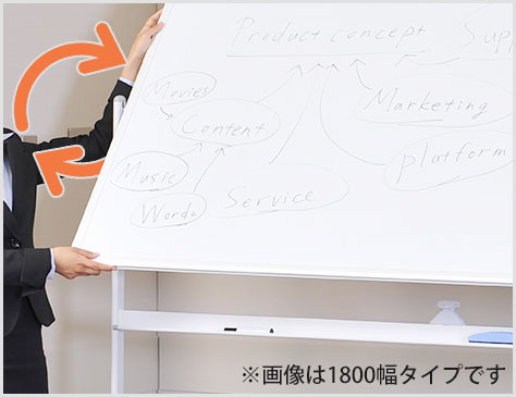 くるっとホワイトボードを回転し、手軽にふたつの面を切り替えることができます。表裏どちらの面にも書ける両面仕様です。
