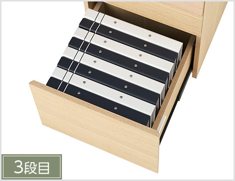 3段目の引き出しは、A4ファイルを横に並べて収納できます。深さがあるので、かさばる物や大きめの物を入れるのにも適しています。