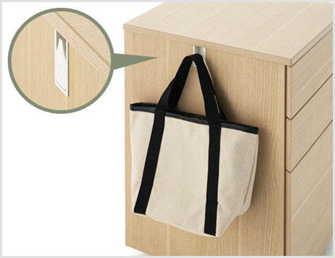 ワゴンの左側に、カバンなどが掛けられるフックを装備(耐荷重5kg)。使用していない時は突起せず平らになるので、邪魔になりません。