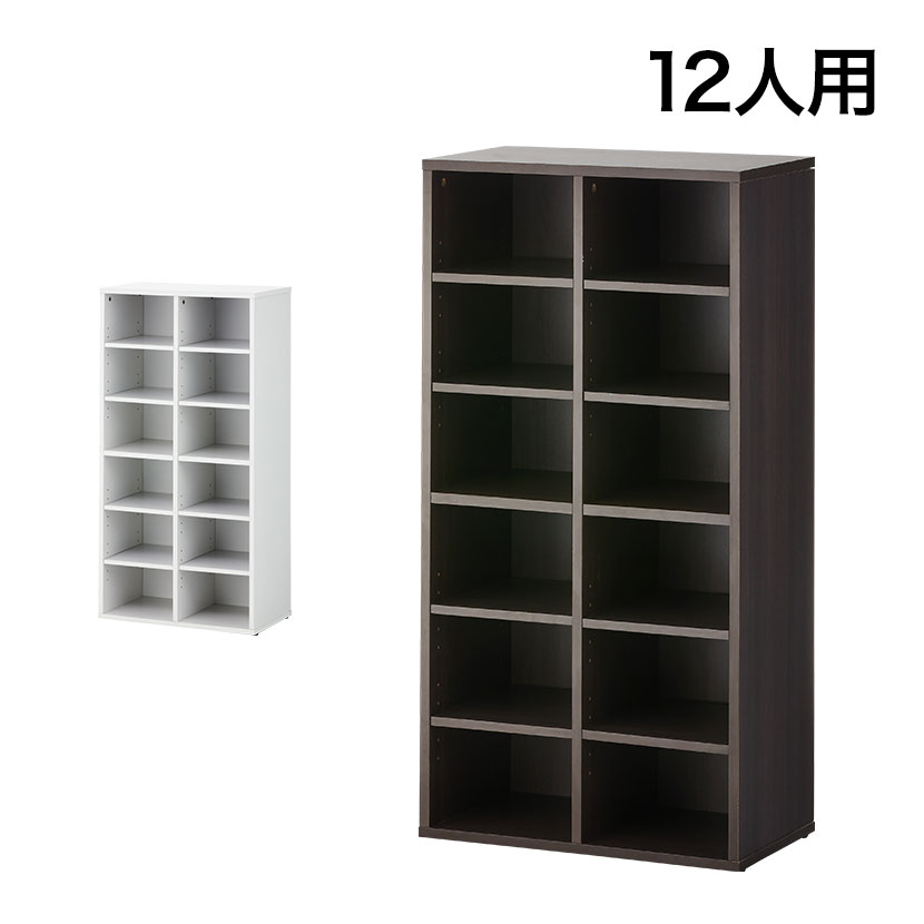 棚板は位置調節や取り外しができる可動式!最大12足収納できるシューズボックスです。ビジネスシューズやハイカットシューズ、ブーツや長靴にいたるまで、様々な靴に対応します。人数の確認や靴の出し入れが容易なオープンタイプ。空間を明るくするホワイトと、汚れが目立ちにくいダークブラウンの2色展開です。コンパクト設計の2列仕様なので、省スペースに設置できます。小規模なオフィスや省スペース化に取り組んでいるオフィスにもおすすめ。