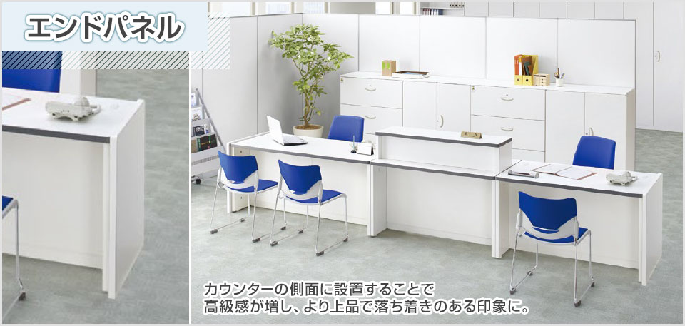 様々な空間にマッチする、スチールカウンターNS型専用のエンドパネルです。カウンターの側面に設置することで、より上品で落ち着きのある印象になります。