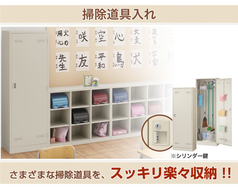 シンプルでコンパクトな見た目、スチール製で頑丈なので掃除道具一式を収納できます。学校、病院、オフィスなどで使える定番掃除用具入れです。安心の国産、完成品でのお届けとなります。