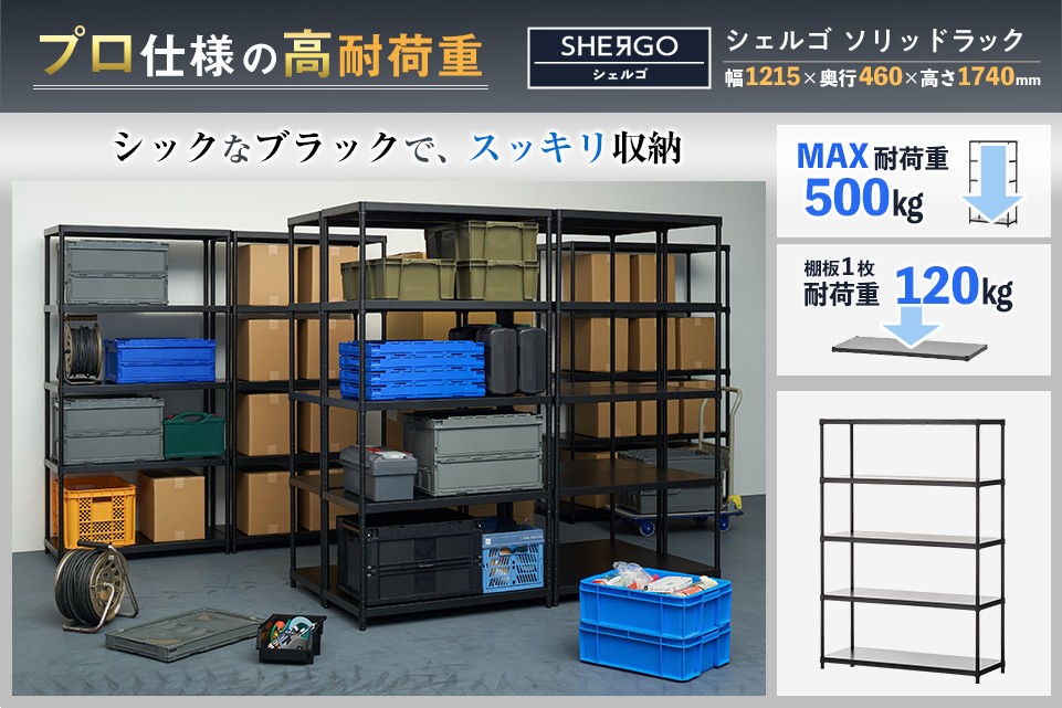 シェルゴのソリッドラックは、棚板がフラットなので荷物がスムーズに出し入れできます。ラック全体の最大耐荷重は500kgあるので、重量のある業務用の荷物も気兼ねなく載せることが可能です。カラーはシックなブラックで、収納をスッキリと見せ空間を引き締めます。また、収納物に合わせて高さを調節することができるため、スペースを有効活用できて倉庫やオフィスの整理におススメです。