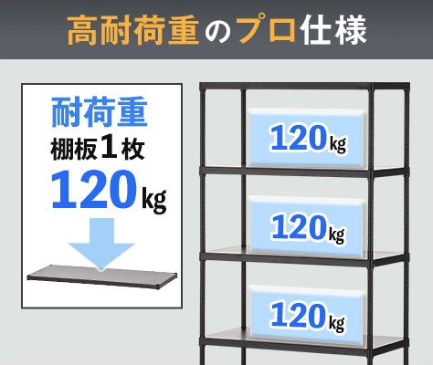 棚板1枚当たりの耐荷重が120kgなので、重たい工具や業務用の荷物などを気兼ねなく収納することができます。