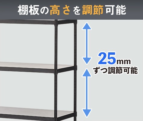 収納したい物に合わせて25mm間隔の高さ調節が可能です。無駄な隙間を減らすことで大量収納を実現します。