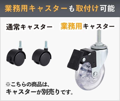別売りの専用キャスターを取り付ければ、可動ラックとして利用可能。ナイロンキャスター2種類と業務用に適しているクリアキャスターをご用意しております(※詳細はページ下部をご覧ください)。