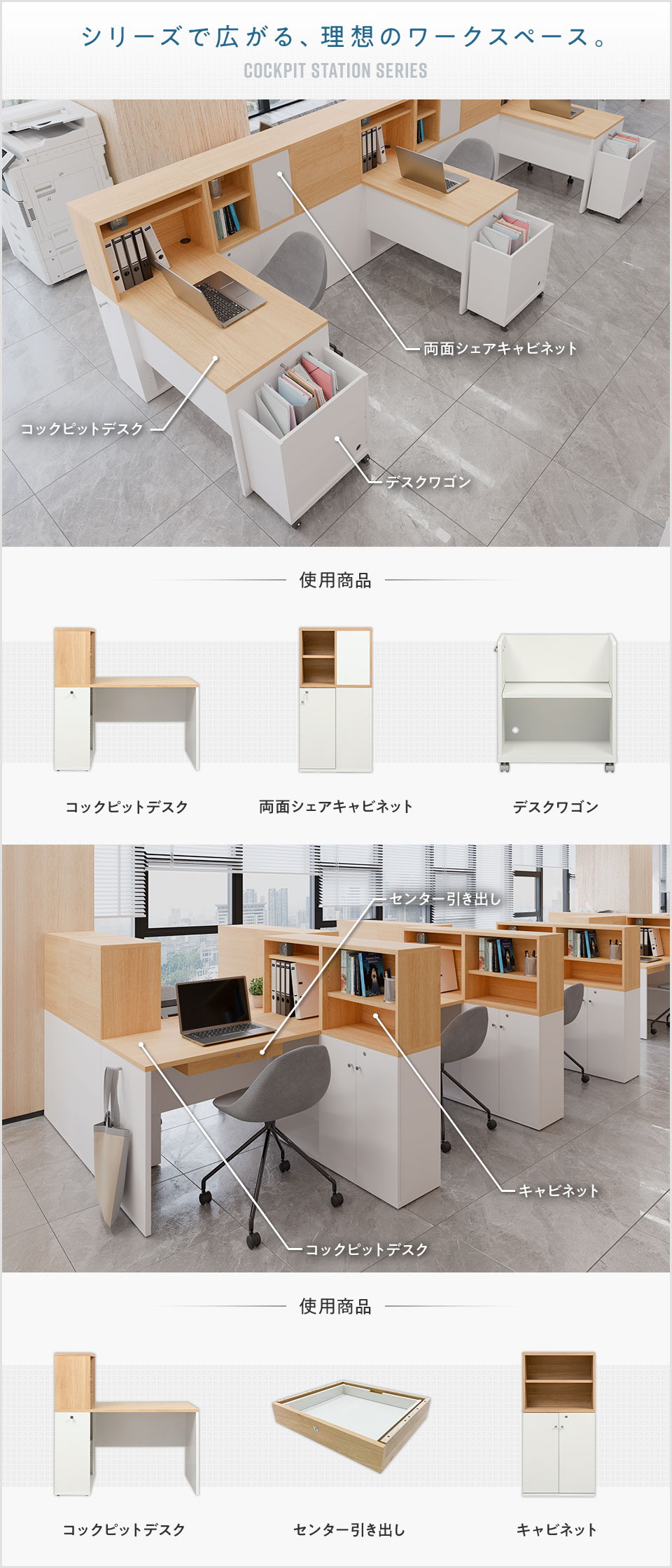 業務内容やスペースに合わせて、周辺商品を自由に選択。L字や対面など多彩なレイアウトが可能で、シリーズで揃えることでデザインに統一感のある、自分にぴったりの仕事環境が整います。