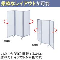 3連タイプのパーテーションです。パネルが360°回転するため、柔軟なレイアウトが可能です。キャスター付きで移動もラクラク!折りたためばコンパクトにすっきり収納できます。
