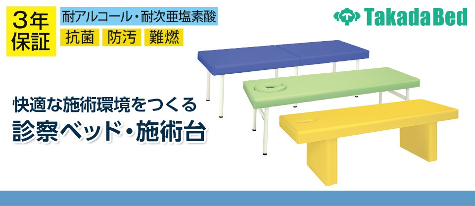 治療院から病院・クリニックの診察室まで幅広く活躍している、診察ベッド・施術台。豊富なカラー展開で空間に合わせてお選びいただけます。