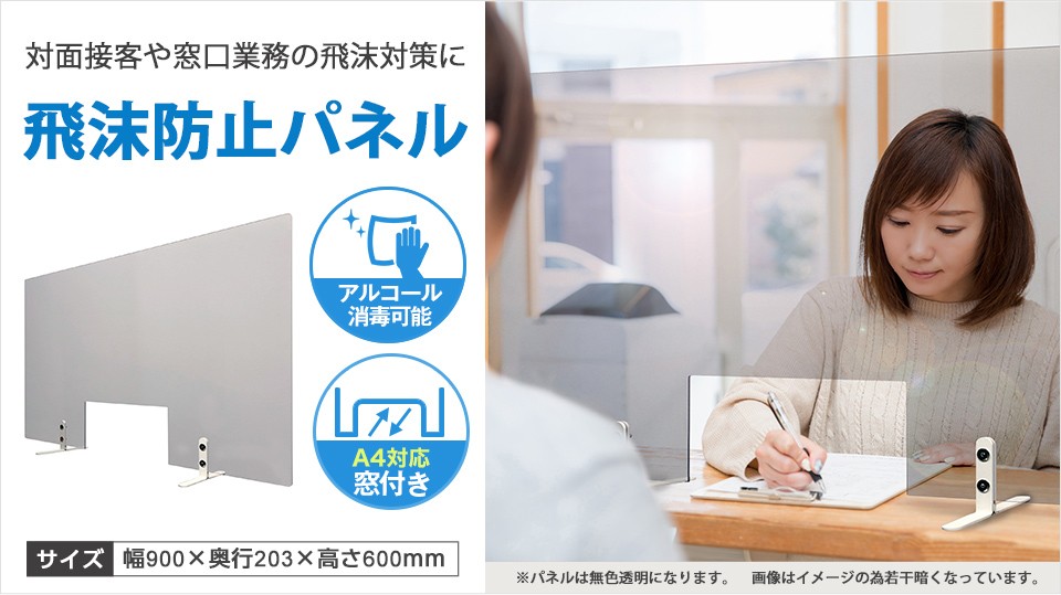 対面接客や窓口業務の飛沫感染防止に役立つデスクパーテーションです。手元にはA4対応窓口があり、書類のやりとりができます。透明なので相手の顔もよく見ることができ円滑なコミュニケーションを図ることができます。材質はPVCを使用しアルコールでの消毒、洗剤の使用も可能な為、清潔に保つ事ができます。