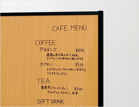 両面木目調ボードタイプの板面は、書き込みが可能。特殊なマーカーは必要なく、通常のホワイトボードマーカーでご利用いただけます。