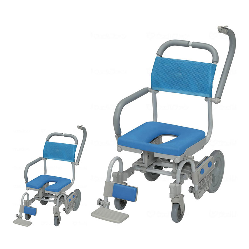 | 機能 | 座面高さ調節(20mmピッチ5段階) 座面シート取り外し 奥行調節 肘掛け跳ね上げ フットレスト跳ね上げ フットレスト着脱 ストッパー付きキャスター |