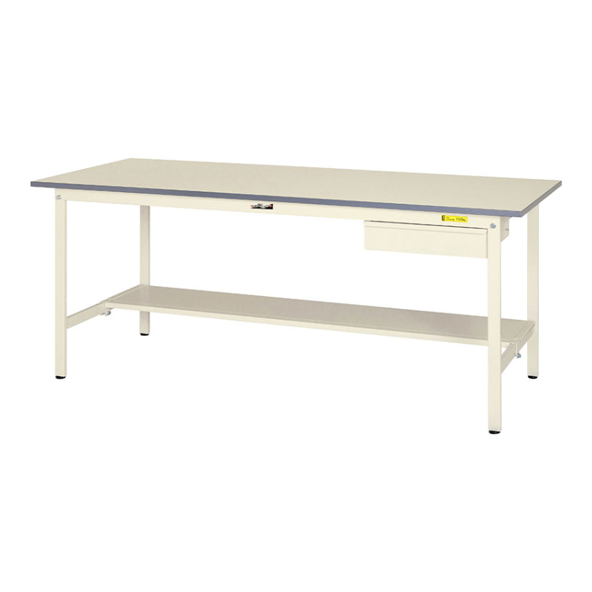 コストダウンと強度の確保を両立したエコモデルの作業台。小物整理に役立つ薄型キャビネット付き。キャビネットはスムーズな開閉が可能です。均等耐荷重150kgで梱包や検品等、軽作業に適しています。高さ740mmで座り作業にお使いいただけます。天板は低圧メラミン化粧板、カラーはホワイトを基調としたシンプルデザインで作業現場・オフィス・学校・イベント会場など多様な環境に対応します。座り作業でも足元の邪魔にならない半面棚板付き。