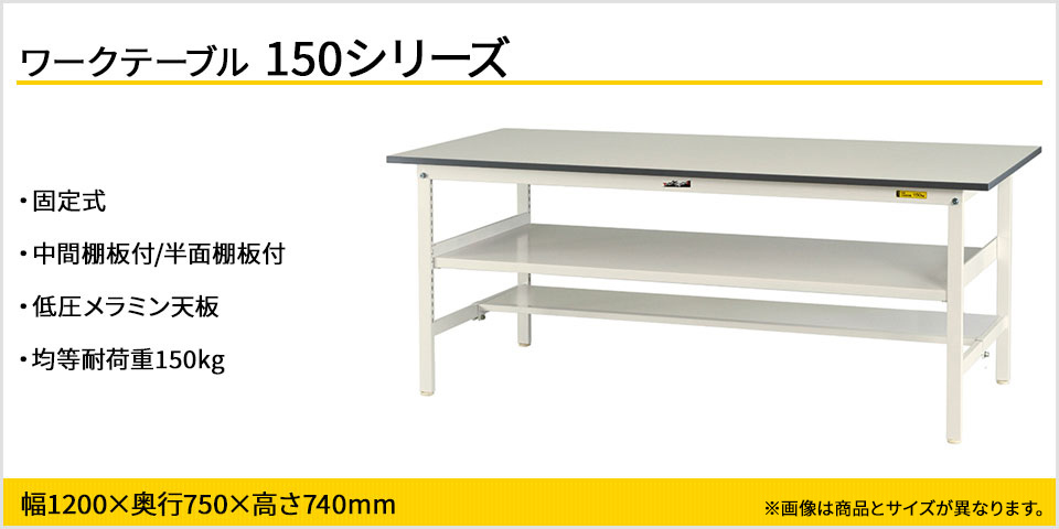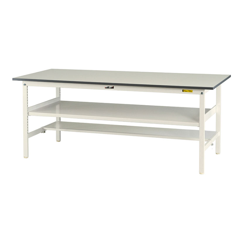 コストダウンと強度の確保を両立したエコモデルの作業台。中間棚付きで天板下のデッドスペースを有効活用できます。均等耐荷重150kgで梱包や検品等、軽作業に適しています。高さ740mmで座り作業にお使いいただけます。天板は低圧メラミン化粧板、カラーはホワイトを基調としたシンプルデザインで作業現場・オフィス・学校・イベント会場など多様な環境に対応します。座り作業でも足元の邪魔にならず、荷物置き場を確保できる半面棚板付き。