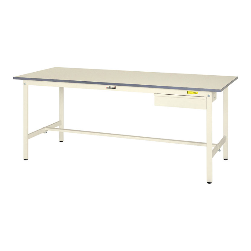 コストダウンと強度の確保を両立したエコモデルの作業台。小物整理に役立つ薄型キャビネット付き。キャビネットはスライドレール採用で、スムーズな開閉が可能です。均等耐荷重150kgで梱包や検品等、軽作業に適しています。高さ740mmで座り作業にお使いいただけます。天板は低圧メラミン化粧板、カラーはホワイトを基調としたシンプルデザインで作業現場・オフィス・学校・イベント会場など多様な環境に対応します。