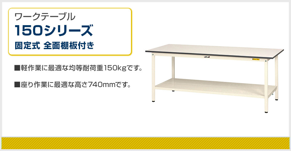 コストダウンと強度の確保を両立したエコモデルの作業台。均等耐荷重150kgで梱包や検品等、軽作業に適しています。高さ740mmで座り作業にお使いいただけます。天板は低圧メラミン化粧板、カラーはホワイトを基調としたシンプルデザインで作業現場・オフィス・学校・イベント会場など多様な環境に対応します。全面棚板付きで大きな荷物も収納できます。