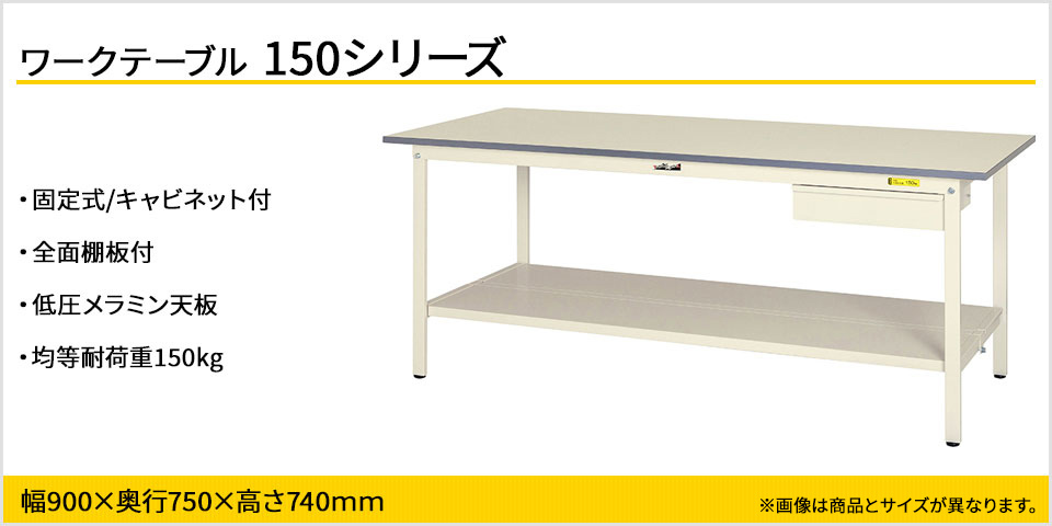 コストダウンと強度の確保を両立したエコモデルの作業台。小物整理に役立つ薄型キャビネット付き。キャビネットはスライドレール採用で、スムーズな開閉が可能です。均等耐荷重150kgで梱包や検品等、軽作業に適しています。高さ740mmで座り作業にお使いいただけます。天板は低圧メラミン化粧板、カラーはホワイトを基調としたシンプルデザインで作業現場・オフィス・学校・イベント会場など多様な環境に対応します。大きな荷物も収納できる全面棚板付き。