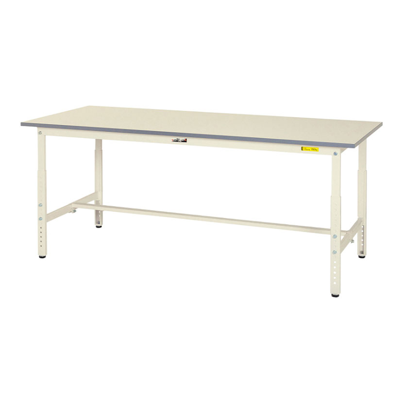 コストダウンと強度の確保を両立したエコモデルの作業台。均等耐荷重150kgで梱包や検品等、軽作業に適しています。作業者の身長や作業内容に合わせて高さ600〜900mmの間で調整が可能です。天板は低圧メラミン化粧板。カラーはホワイトを基調としたシンプルデザインで作業現場・オフィス・学校・イベント会場など多様な環境に対応します。