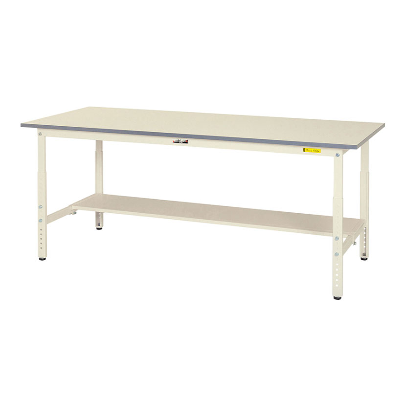 コストダウンと強度の確保を両立したエコモデルの作業台。均等耐荷重150kgで梱包や検品等、軽作業に適しています。作業者の身長や作業内容に合わせて高さ600〜900mmの間で調整が可能です。天板は低圧メラミン化粧板。カラーはホワイトを基調としたシンプルデザインで作業現場・オフィス・学校・イベント会場など多様な環境に対応します。座り作業でも足元の邪魔にならず、荷物置き場を確保できる半面棚板付き。