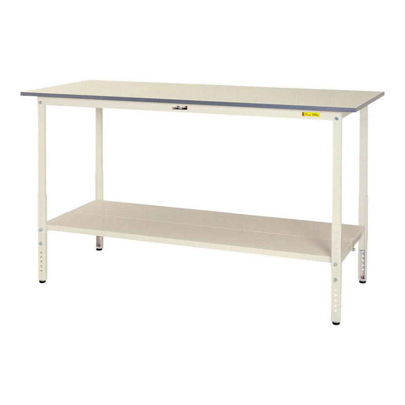 コストダウンと強度の確保を両立したエコモデルの作業台。均等耐荷重150kgで梱包や検品等、軽作業に適しています。作業者の身長や作業内容に合わせて高さ900〜1200mmの間で調整が可能です。天板は低圧メラミン化粧板。カラーはホワイトを基調としたシンプルデザインで作業現場・オフィス・学校・イベント会場など多様な環境に対応します。全面棚板付きで大きな荷物も収納可能です。