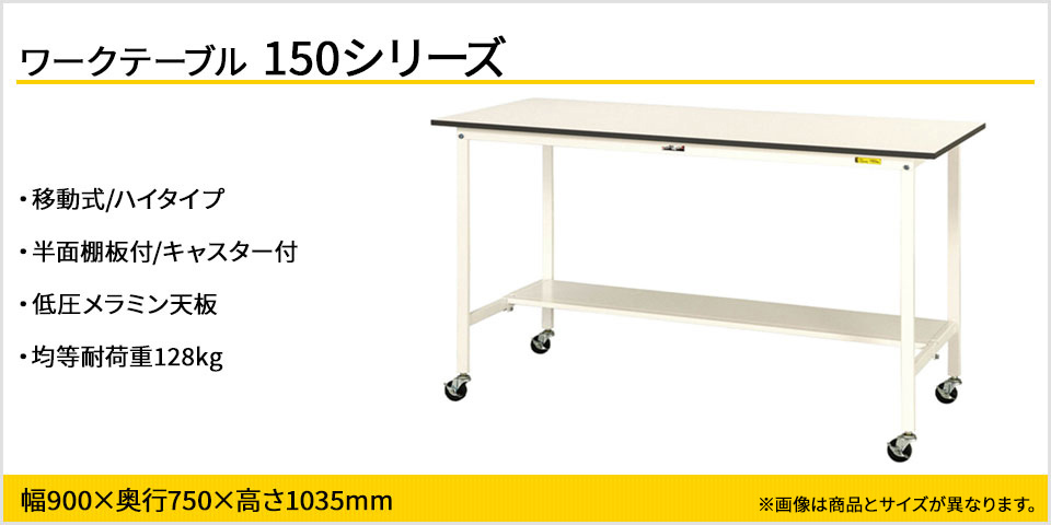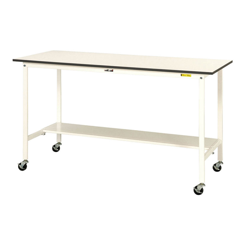コストダウンと強度の確保を両立したエコモデルの作業台。全体均等耐荷重128kgで梱包や検品等、軽作業に適しています。自在ストッパー付きのゴムキャスターでレイアウト変更が簡単にできます。高さ1035mmで少し高めの立ち作業にお使いいただけます。天板は低圧メラミン化粧板、カラーはホワイトを基調としたシンプルデザインで作業現場・オフィス・学校・イベント会場など多様な環境にマッチします。足元に余裕がありながら荷物も置ける半面棚板付き。