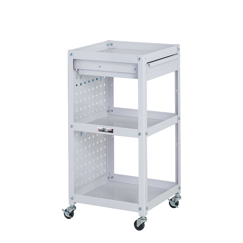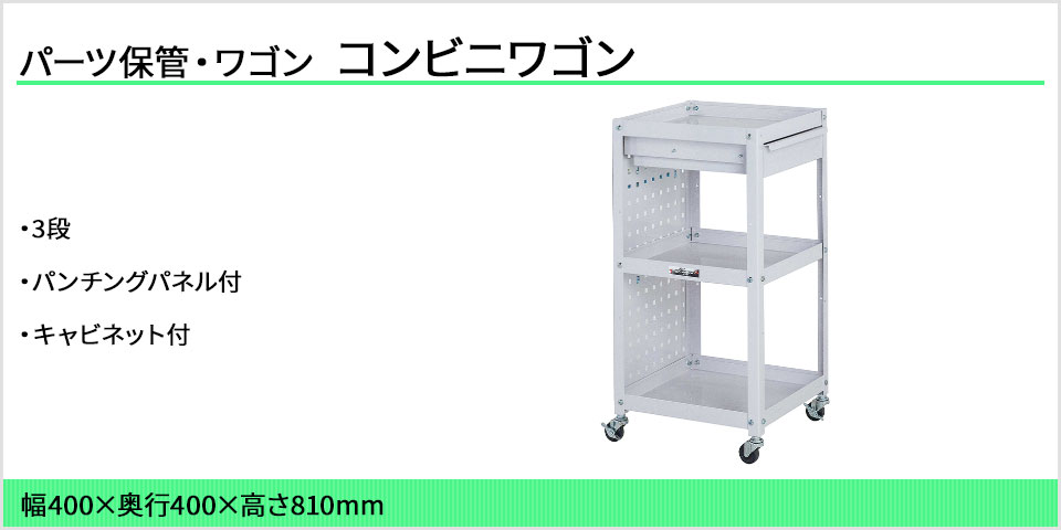 | 商品の特長 | ●1台あると便利!シンプルで使い勝手がいいワゴン。 ●オフィス・工場・倉庫・物流現場などでの軽作業(梱包、検品、検査、包装、組立、加工など)に。 ●パンチングパネル・キャビネット付き3段。 ●キャスターは、弾力があり凹凸のある地面でも走行しやすいゴムキャスターです。 ●棚板サイズは幅400×奥行400mm。裏表どちらの向きでも使用できます。 ●パンチングパネルに付属のフック(4種各1個)は、工具の収納に最適です。 ●キャビネットはスライドレールによりスムーズな開閉が可能。工具や部品の収納におすすめです。 |